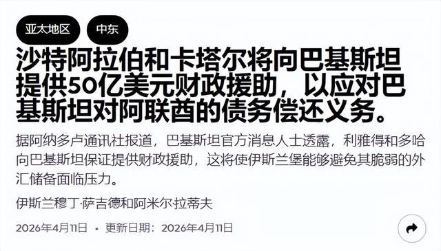 另据土耳其阿纳多卢通讯社的说法,有巴官方消息人士透露,沙特与卡塔尔已承诺向巴基斯坦提供50亿美元的财政援助,以帮助巴方在6月份之前偿还其国际债务、稳定外汇储备。